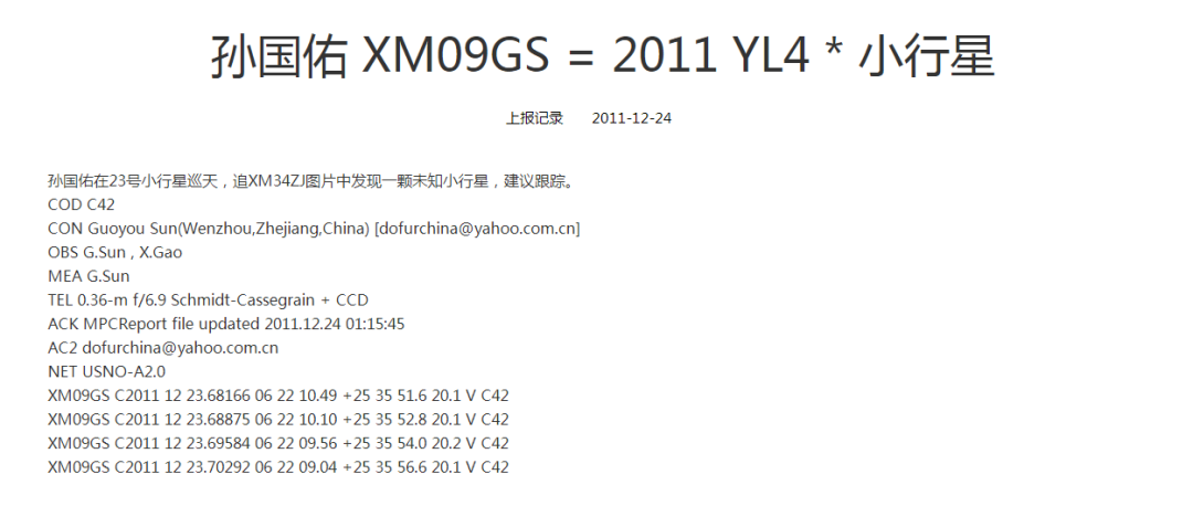 2020年6月3日,国际天文学联合会国际小行星中心(MPC,Minor Planet Center)发布了最新的小行星通告/小行星与彗星轨道补编(MPO,The MINOR PLANET CIRCULARS/MINOR PLANETS AND COMETS ORBIT SUPPLEMENT),孙国佑和高兴两位老师在2011年12月23日发现的临时编号为2011 YL4的小行星获得永久编号——546049,这是国内首颗由业余天文爱好者使用业余器材获得永久编号的小行星,实现了国内业余小行星发现零的突破,意义重大!