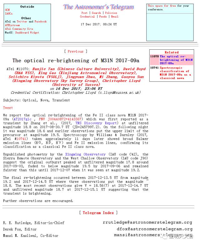 我们报告了Fe II型新星M31N 2017-09a(AT2017glc,PNV J00440872 +4143367)在光学上的再次增亮,这颗新星被张申炜等人发现(2017年,TNS发现报告链接https://www.wis-tns.org/object/2017glc),首次报告中说明在世界时2017年月8月30.7 日(儒略日2457997.2日)亮度18.8等。第二天晚上,亮度是18.6等,早些时候的观测结果确定了该新星前体的亮度暗于19.5等。Williams和Darnley(2017年,ATEL 10741号公报,链接http://www.astronomerstelegram.org/?read=10741 )拍摄了该新星被发现大约11天后的光谱,光谱图像显示出明显的巴尔末发射谱线(Hα,Hβ,Hγ)和Fe II发射谱线,证实其分类为Fe II型典型新星。