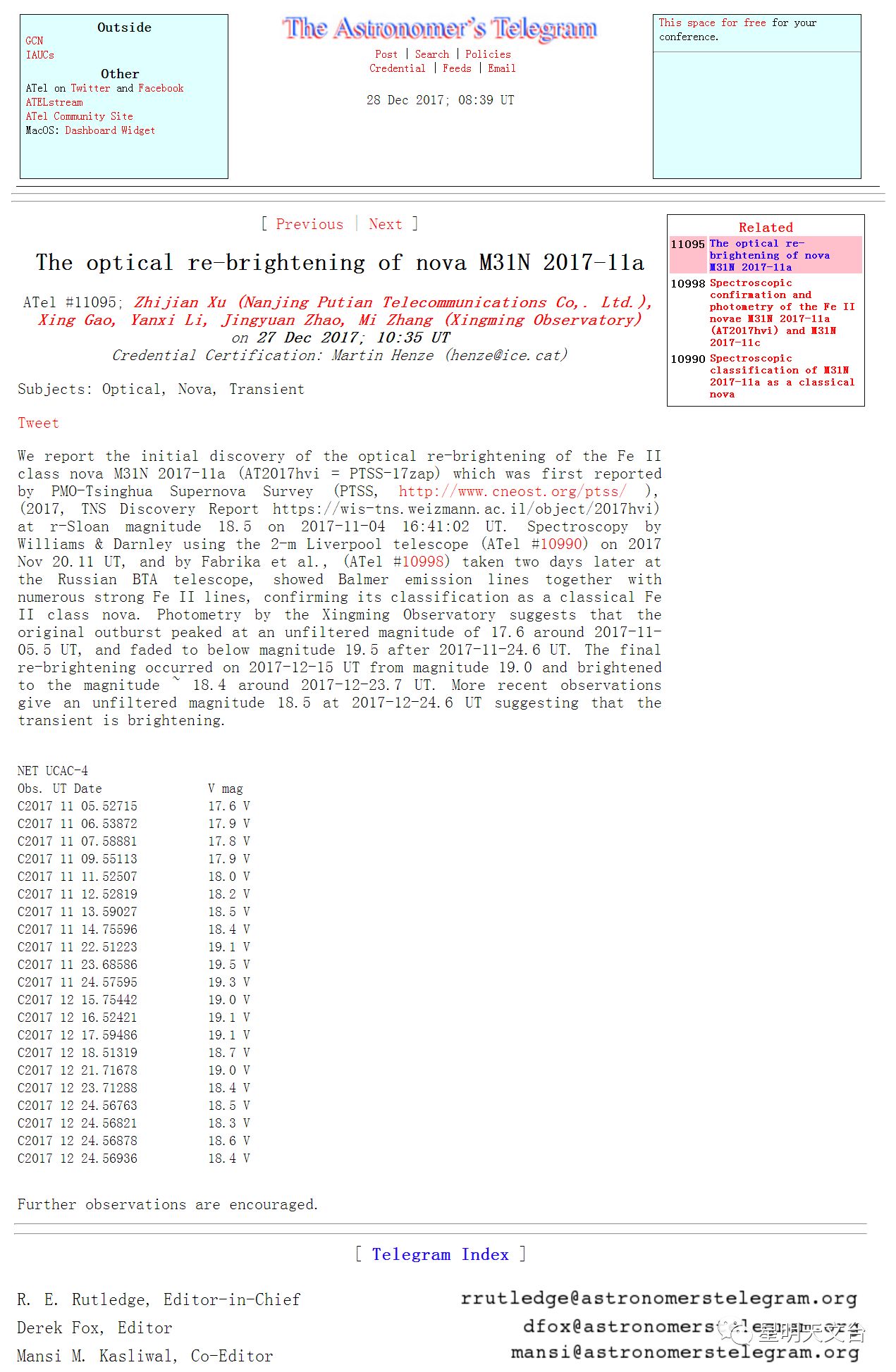 我们发现并报告了Fe II型新星M31N 2017-11a(AT 2017hvi = PTSS-17zap)光学上的再次增亮。这颗新星最初由紫金山天文台-清华大学超新星巡天项目(PTSS,http://www.cneost.org/ptss/)于2017年11月4日 16:41:02(世界时)上报(2017年,TNS发现报告链接https://www.wis-tns.org/object/2017hvi),r-Sloan滤镜亮度18.5星等。2017年11月20.11日(世界时)Williams和Darnley利用利物浦2米望远镜拍摄了该新星的光谱(ATel 10990号公报 ),Fabrika等人在两天后也用俄罗斯经纬台式大望远镜(BTA)拍摄了该新星的光谱(ATel 10998号公报),光谱图像均显示出巴尔末发射谱线和许多Fe II发射谱线,证实其分类型为Fe II型经典新星。星明天文台的亮度测定表明,在无滤镜的情况下,爆发初期2017年11月5.5日前后(世界时)亮度达到17.6星等,在2017年11月24.6日(世界时)后降至暗于19.5星等。最近的增亮发生于2017年12月15日(世界时)到2017年12月23.7日(世界时)前后,亮度从19.0等增亮至18.4等。最近的观测显示,这颗新星的亮度在2017年12月24.6日(世界时)为18.5等,表明该新星的再次增亮。