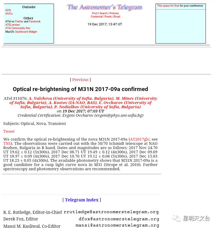 2017年12月19日晚,PSP公众超新星搜寻项目发现的经典新星M31N 2017-09a再亮事件被保加利亚索菲亚大学、保加利亚天文研究所-国家天文台(IA-NAO)和保加利亚科学院(BAS)的天文学家确认并发布ATEL公报(ATEL #11076)。公报认为这是一颗很好的M31星系中的尖峰光变曲线新星候选体,并建议进一步观测。