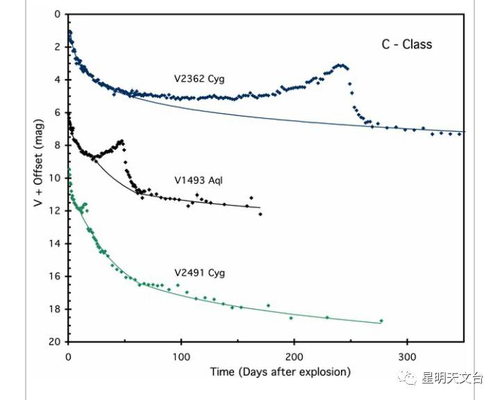 三个尖峰光变曲线新星的光变曲线(横坐标为距离爆发后的时间,纵坐标为亮度)